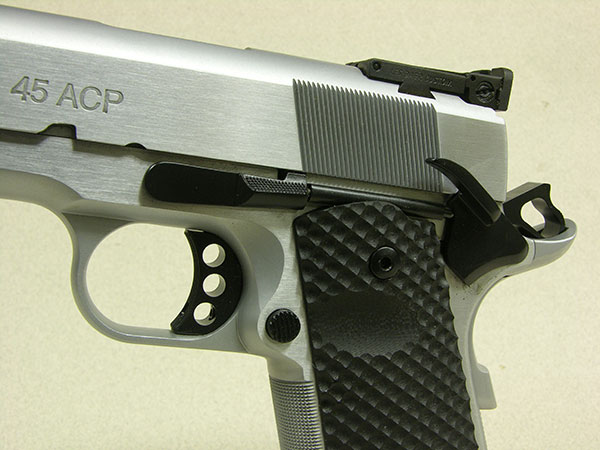 The operating controls and other externally visible parts are finished in matte black DuPont S. These include the slide stop, ambidextrous safety, magazine catch and magazine catch lock, hammer, trigger, barrel, plunger tube, hammer pin, sear pin, recoil plug and hex-head grip screws. The subtle overall effect of matte black contrasted with satin chrome is quite pleasing.