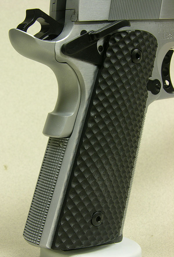 All parts are Les Baer's, coated with black DuPont S, which contrasts nicely with the natural chrome finish. The thumb safety is an ambi.