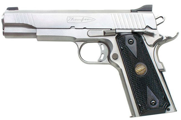 1911 Custom Stainless . It's a Government model built with a 420 stainless steel cast frame and machined stainless slide. It has low-profile sights and checkered laminate grips with the Thompson bullet logo. Both the mainspring housing and frontstrap are checkered at 20 lpi, and it features an adjustable trigger and extended magazine release and beavertail grip safety. It ships with one seven-round magazine.